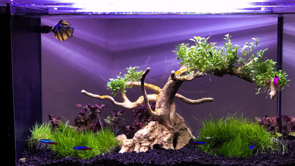 Adding invertebrates, such as snails (bumblebee snails) or shrimp (cherry shrimp, Amano Shrimp), is another great way to liven up your aquarium without taking up too much space or requiring additional maintenance work. As far as plants go, some low-maintenance varieties that do well in smaller tanks include Java Ferns and Anubias Nana, even if you add pothos plants on top, which will help keep your water clean while providing hiding spots for your fishy friends.